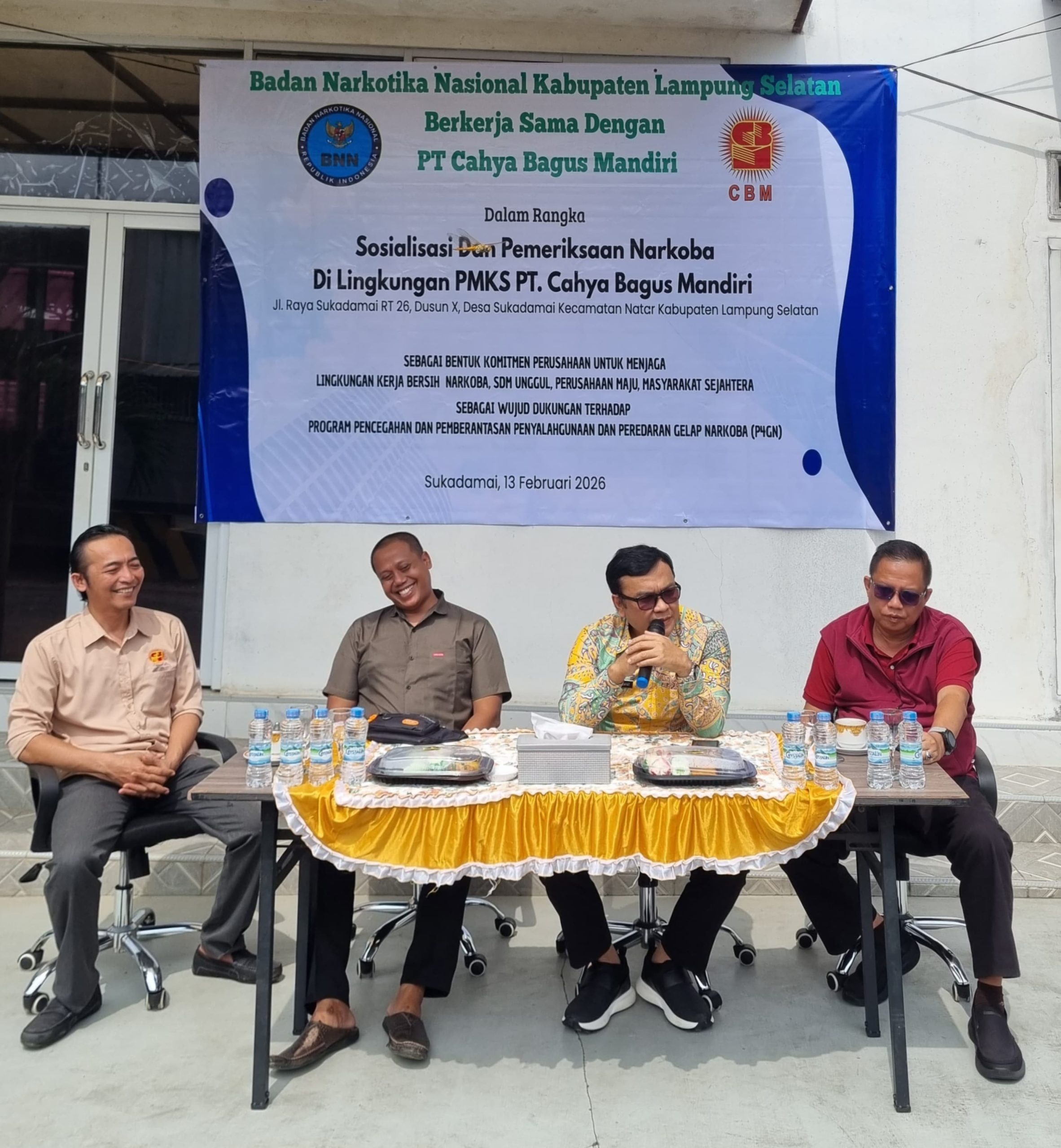 Lampung Selatan | paspampers.com – Jumat 13 Februari 2026 PT.CBM melakukan kegiatan positif bekerjasama BNNK Lampungselatan untuk membangun mutu kwalitas sumber daya manusia dengan memberikan sosiasilasi dan test urine terhadap semua karyawan perusahaan yang berlokasi di Jl.Sukadamai dusun 9 Desa Sukdamai Kec.Natar Kabupaten Lampung Selatan.