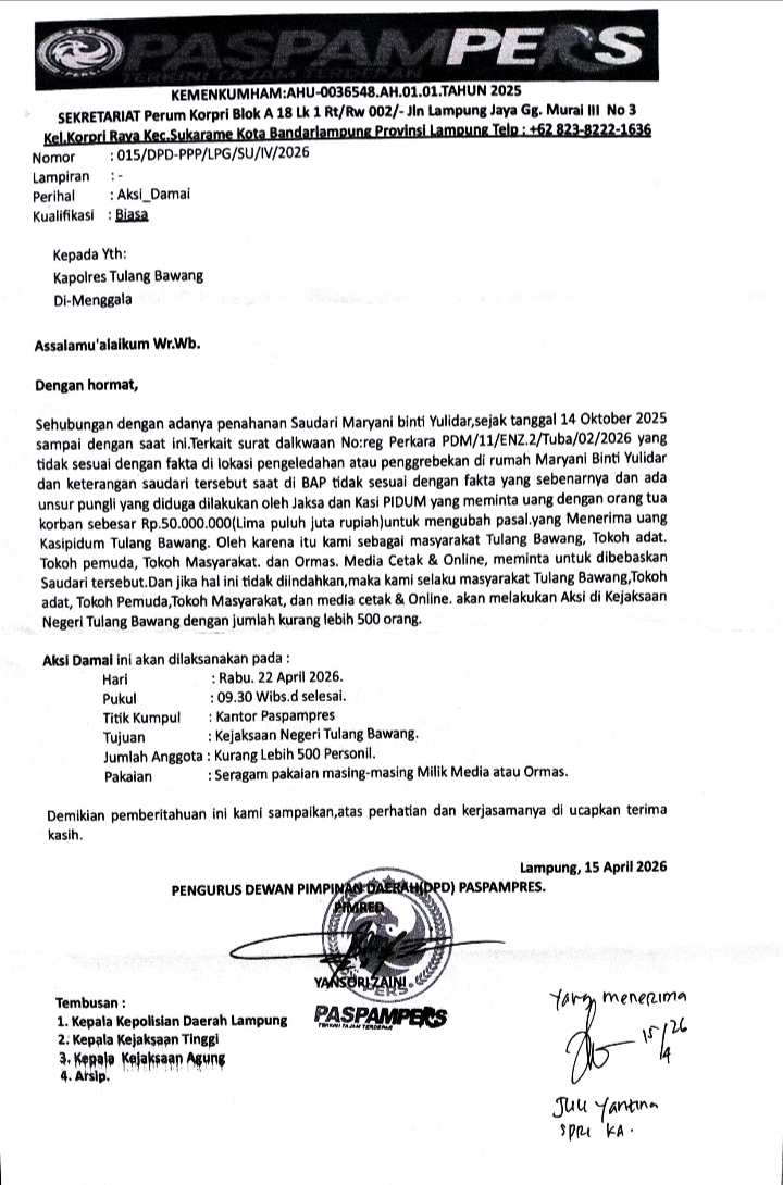 Tulang Bawang | paspampers.com – Yansori Zaini selaku pimred media paspampers telah melayangkan Surat ke kepolisian Polres Tulang Bawang guna mempertegas bentuk perlawanan terhadap seorang perempuan yang diduga tidak bersalah namun dihukum.